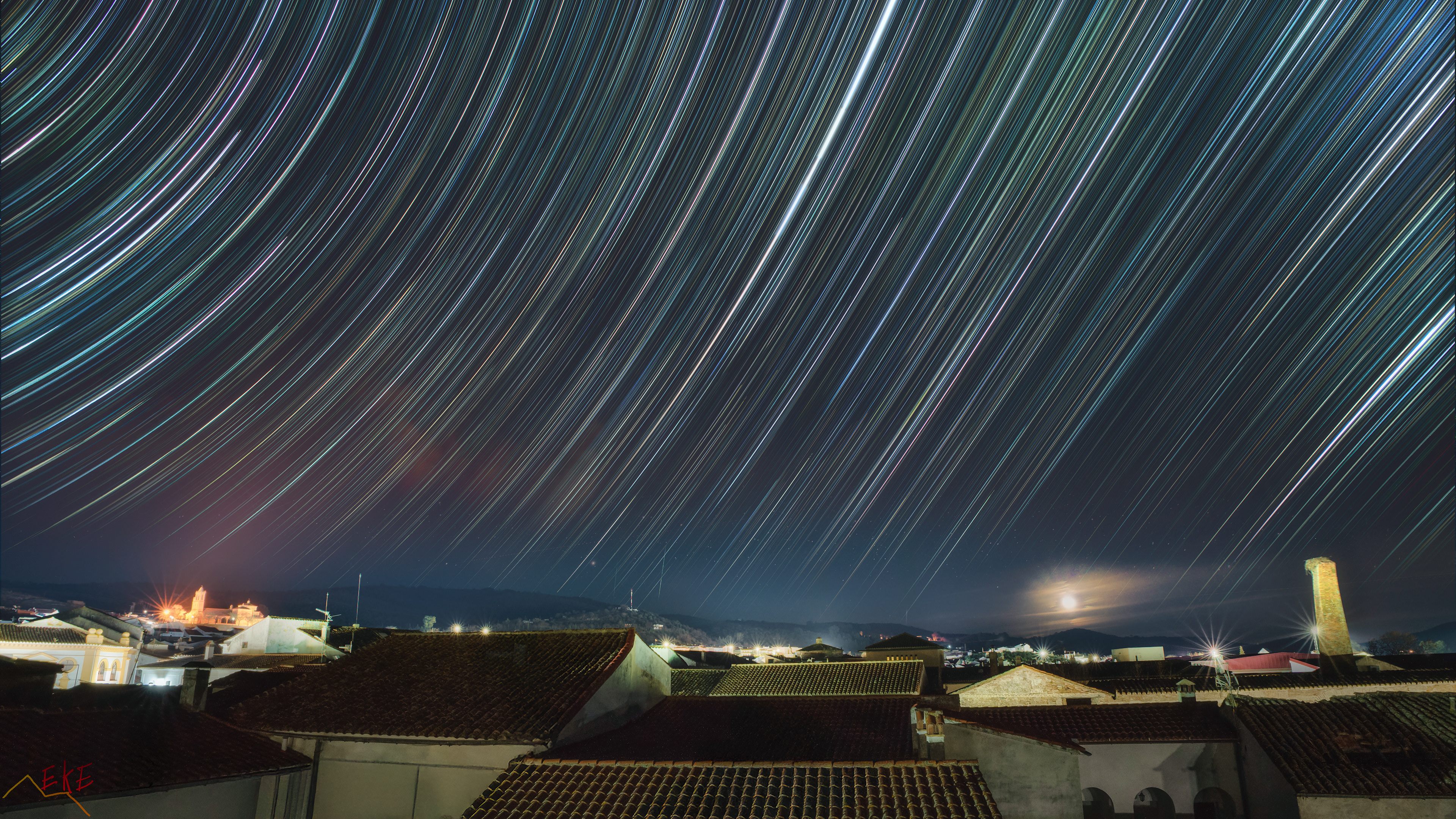 Traza de estrellas sobre la localidad de Guadalcanal en La Sierra Norte de Sevilla desde El Mirador del Cristo.